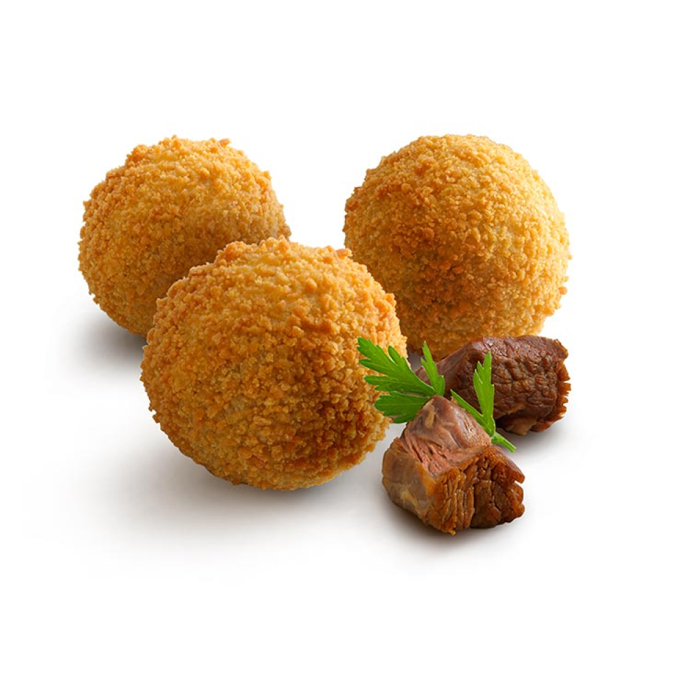 Gekookte ragout met draadjes rundvlees, bouillon, kruiden omhuld met paneermeel.