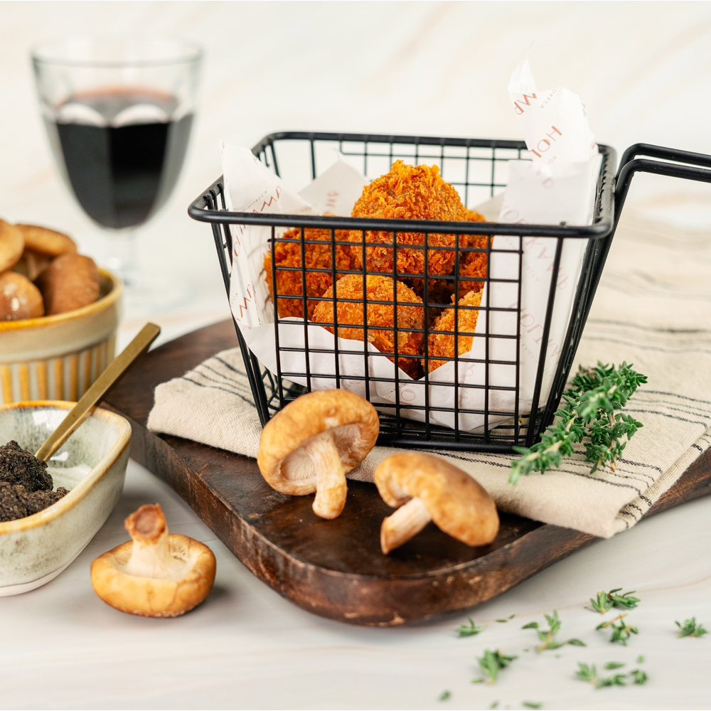 De geheel plantaardige paddenstoel truffel (mini) croquetten en bitterballen zijn een welkome aanvulling in het Holtkamp Horeca assortiment. Onze VEGAN croquet kenmerkt zich door een uitgebalanceerde compositie van in brunoise gesneden oesterzwammen, eekhoorntjesbrood, shii-take en bundelzwammetjes. Aan de plantaardige, glanzende paddenstoelen salpicon hebben we 1% fijngesneden Italiaanse zwarte truffel toegevoegd. Met het karakteristieke flinterdunne brosse korstje van broodkruim is deze hoog op smaak gebrachte luxe VEGAN variatie een waardevolle en smaakvolle toevoeging op uw menukaart.