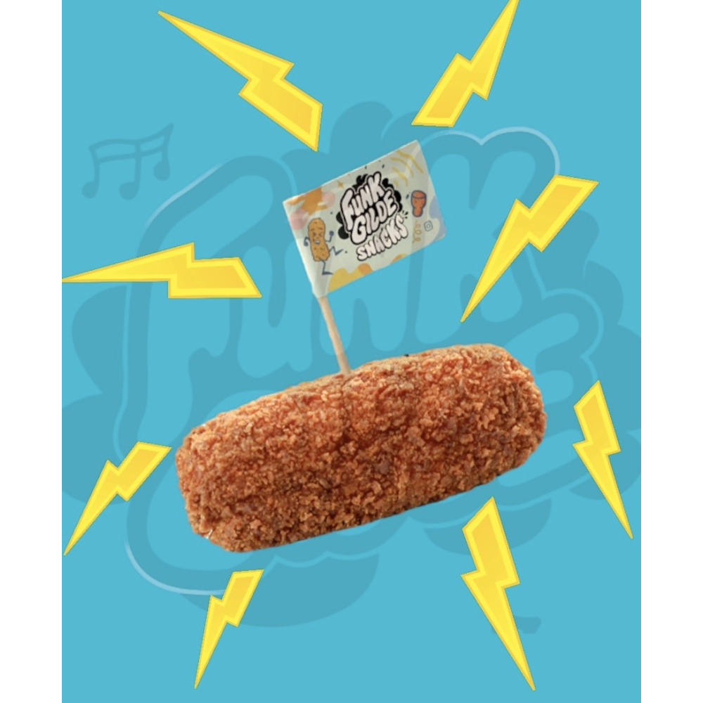 De klassieker van Funk Gilde, de kroket waar het allemaal mee begon. Met ragout op basis van Oh Na Mi Kimchi (op Koreaanse wijze gefermenteerde pittige kool), met stukjes kimchiwortel voor een extra funky bite en een krokant geel jasje.