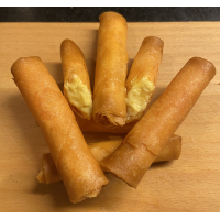 Een handgerold flensje van filodeeg gevuld met 70,5% oude kaas. Lekker krokant en in 3 minuten klaar.